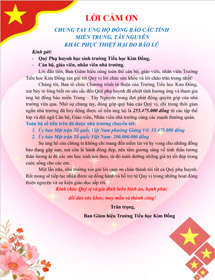 Toàn văn Thư cảm ơn của Nhà trường gửi đến Quý Phụ huynh học sinh và tập thể Cán bộ - giáo viên - nhân viên:
