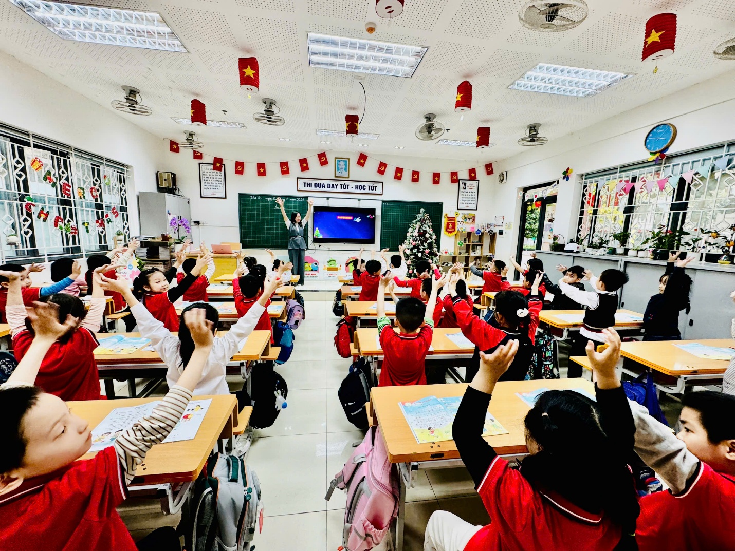 Trong một tiết học Âm nhạc của học sinh lớp 1A2 trường Tiểu học Kim Đồng, không khí lớp học diễn ra vô cùng sôi nổi và thân thiện. Ngay từ những phút đầu, cô giáo đã khéo léo dẫn dắt học sinh bằng những hoạt động khởi động thực hiện các động tác vận động đơn giản. Cách tổ chức linh hoạt giúp các em nhanh chóng hòa nhập, cảm thấy thoải mái và sẵn sàng tham gia vào các hoạt động học tập.