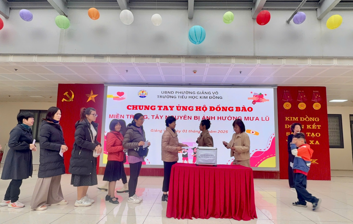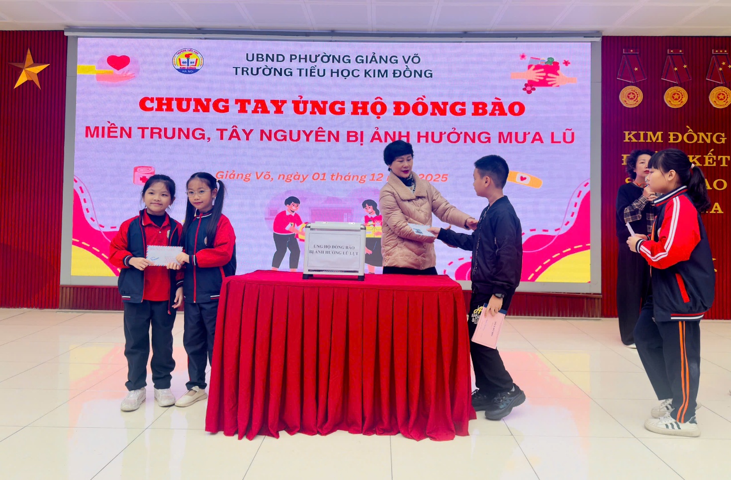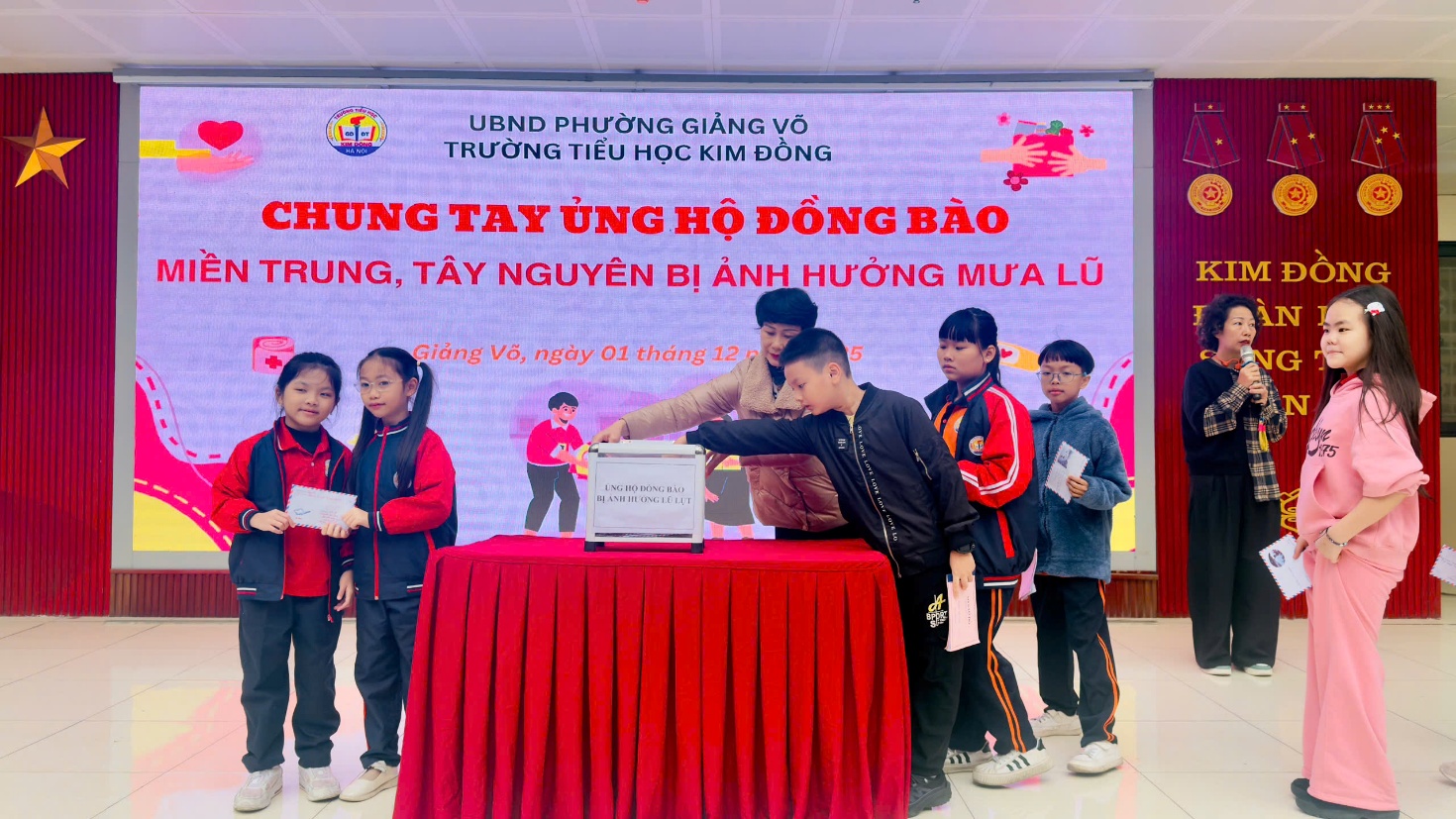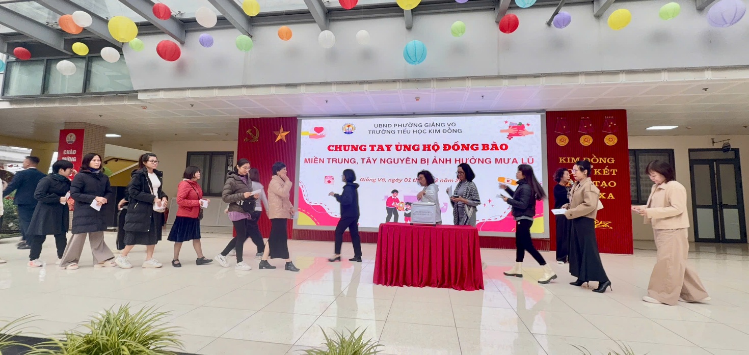 Sáng ngày 1/12/2025, trong tiết trời cuối năm se lạnh, sân trường Tiểu học Kim Đồng bỗng ấm lên lạ thường bởi một nguồn năng lượng thật đẹp: tinh thần sẻ chia, tương thân tương ái. Hưởng ứng Lời kêu gọi của MTTQ Việt Nam và UBND phường Giảng Võ, toàn thể cán bộ, giáo viên, nhân viên, học sinh và phụ huynh đã hoàn thành đợt quyên góp, ủng hộ đồng bào miền Trung, Tây Nguyên chịu thiệt hại nặng nề trong đợt bão lũ vừa qua.