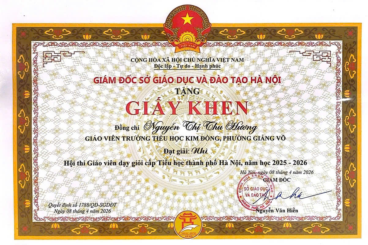 Kết quả, cô giáo Nguyễn Thị Thu Hương đã xuất sắc đạt Giải Nhì cấp Thành phố. Thành tích này là sự ghi nhận xứng đáng cho nỗ lực, tâm huyết và năng lực chuyên môn vững vàng của cá nhân cô giáo. Đồng thời, đây cũng là minh chứng rõ nét cho chất lượng đội ngũ và định hướng đổi mới hiệu quả của Trường Tiểu học Kim Đồng