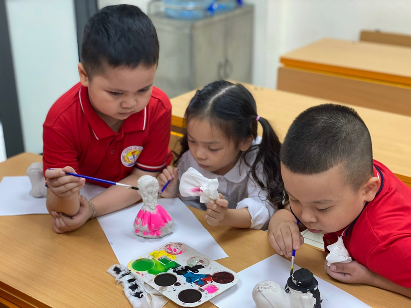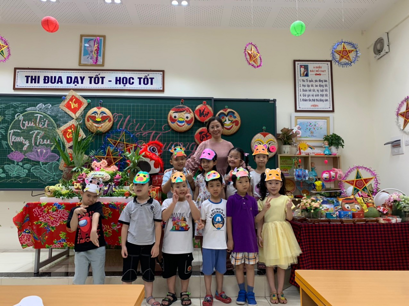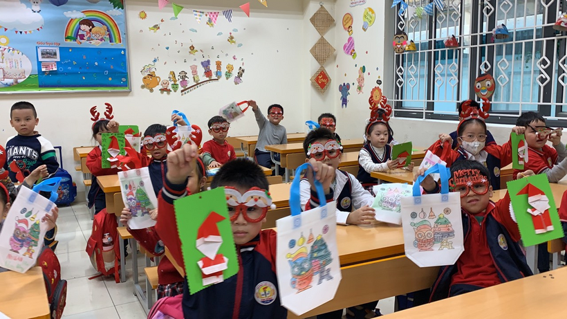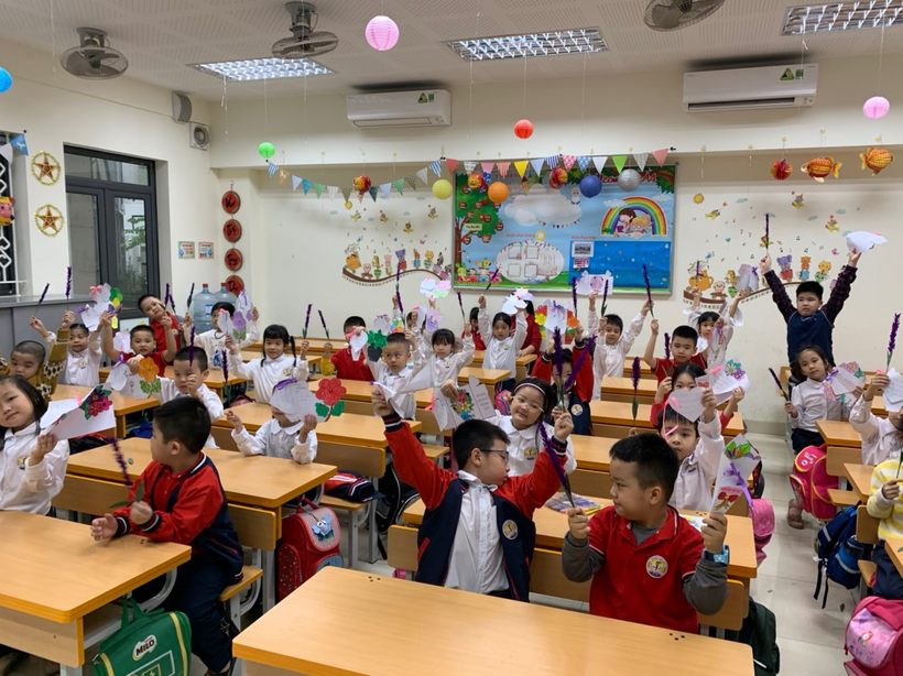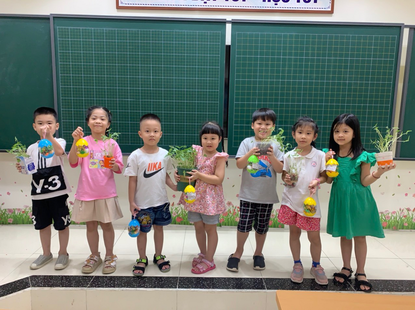 Ngoài nhặt rau, trồng nấm, các con học sinh lớp 1A4 còn được cô hướng dẫn làm các bưu thiếp, vẽ hình, tô tượng, làm mặt nạ … theo chủ đề tháng.