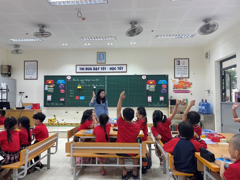 Tham dự tiết hội giảng Toán Khối hộp chữ nhật, khối lập phương, cô trò 1A8 được vinh dự đón Ban Giám Hiệu cùng các cô giáo trong Hội đồng nhà trường.