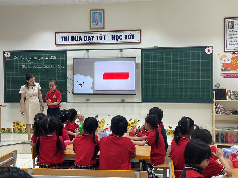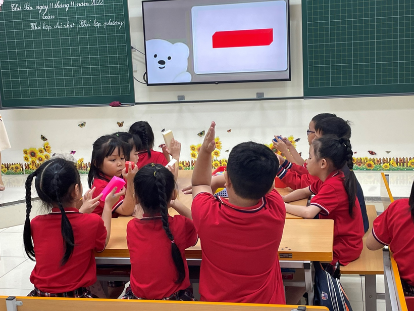 Môn Toán lớp 1 chương trình giáo dục phổ thông 2018 do bộ GD và ĐT ban hành đã đưa bài dạy về khối hộp chữ nhật, khối lập phương vào ngay từ đầu năm học với mục tiêu giúp học sinh nhận dạng được khối hộp chữ nhật, khối lập phương thông qua việc sử dụng bộ đồ dùng học tập cá nhân hoặc vật thật. Học sinh cũng nhận biết và thực hiện được việc lắp ghép , xếp hình gắn với sử dụng bộ đồ dùng học tập cá nhân hoặc vật thật. Buổi học ngày 11/11, cô Hương và các bạn lớp 1A8 đã được trải nghiệm tiết “Khối hộp chữ nhật, khối lập phương” rất bổ ích và lí thú.