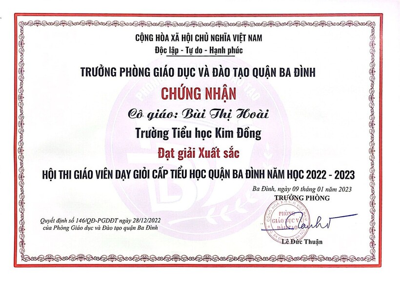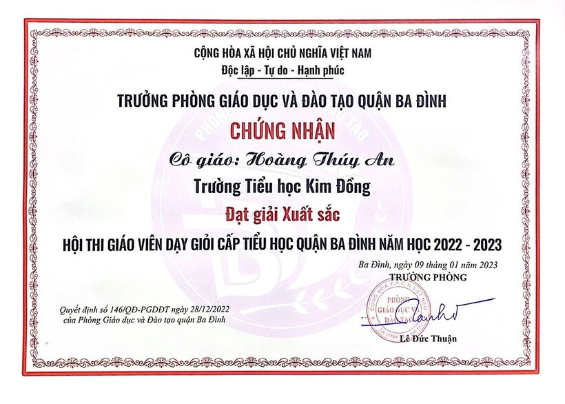 Hai tiết dạy được Ban giám khảo và các đồng nghiệp đánh giá cao về chất lượng và hiệu quả giáo dục. Ngày 9/1/2023, tin vui bay về với trường Tiểu học Kim Đồng khi hai cô giáo chính thức nhận được giấy chứng nhận Tiết dạy đạt giải xuất sắc, cô Thanh Tâm dự thi Tiếng Anh đạt giải Nhất, và tập thể giáo viên của trường đạt giải Xuất sắc trong Hội thi Giáo viên giỏi cấp Tiểu học quận Ba Đình năm học 2022-2023. Cô giáo Bùi Thị Hoài tiếp tục được Phòng Giáo dục chọn cử đi thi Giáo viên dạy giỏi cấp thành phố. Đây là thành tích rất đáng biểu dương, ghi nhận xứng đáng nỗ lực của cả tập thể cũng như của riêng hai cô giáo lớp Một.