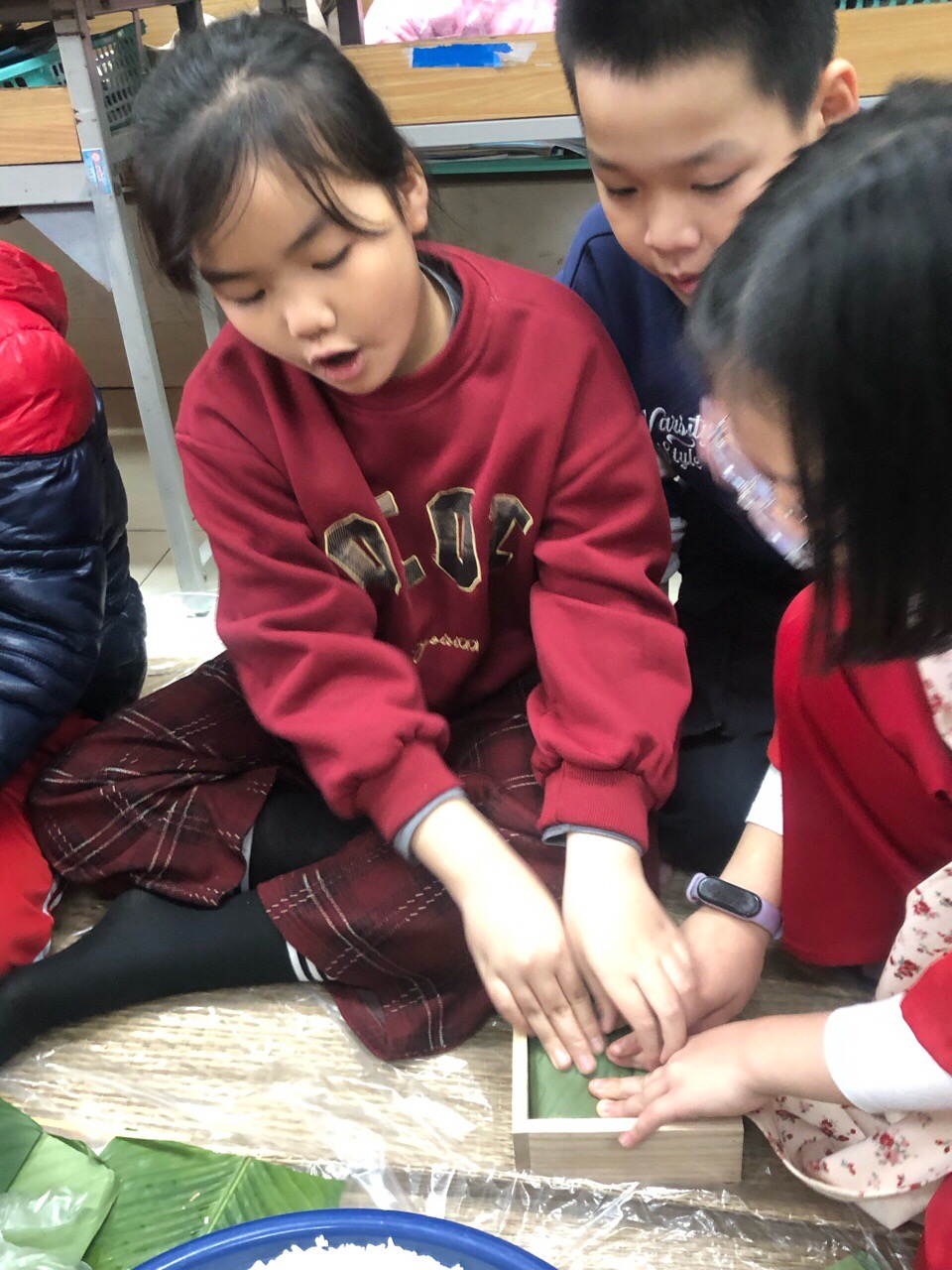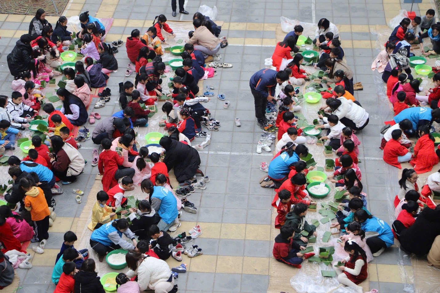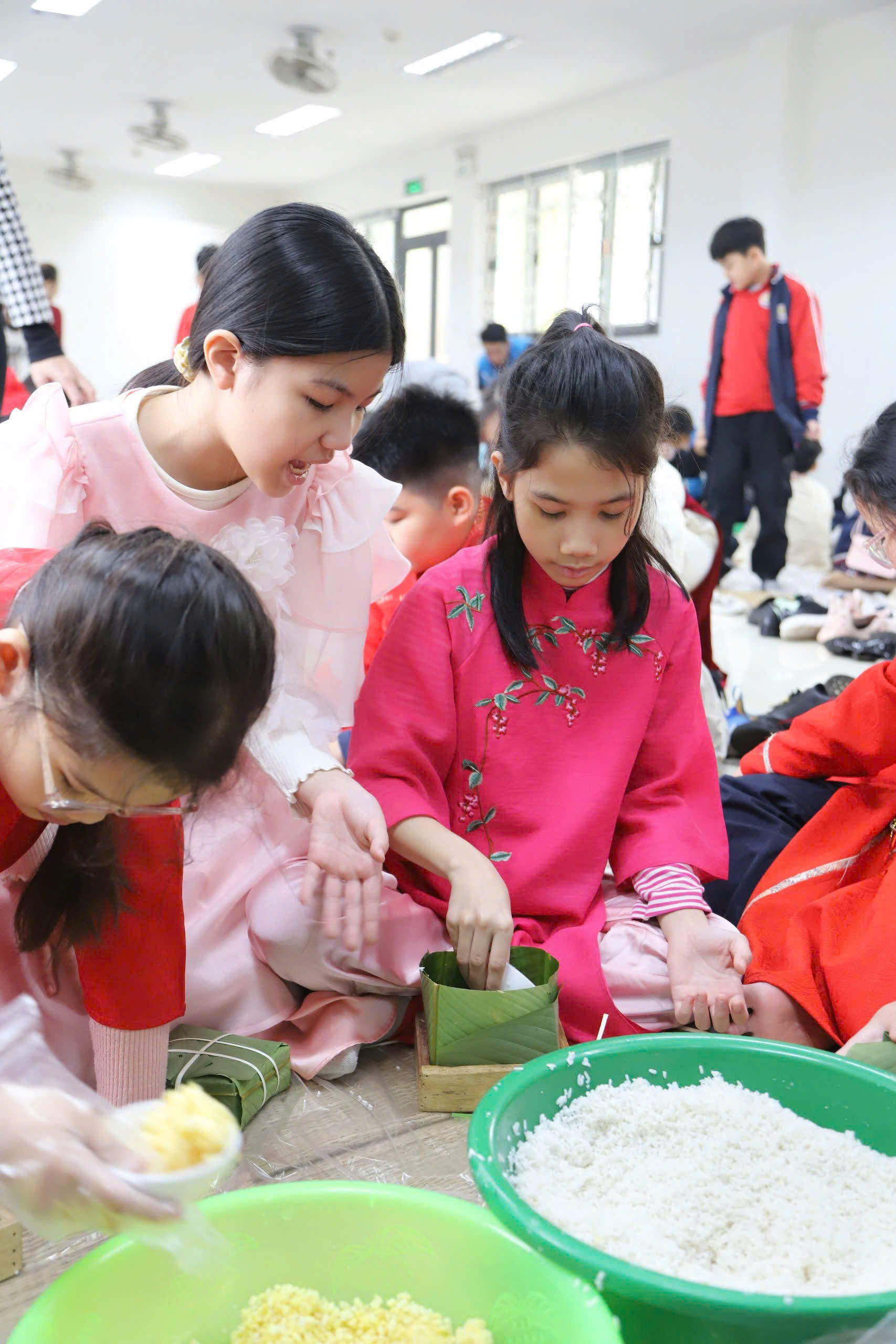 Sau phần khai mạc, Lễ hội bánh chưng tiếp tục với các hoạt động hấp dẫn và thú vị. Một trong những hoạt động nổi bật là gói bánh chưng. Các em được chia thành lớp và cùng nhau tham gia gói bánh chưng, từ khâu chuẩn bị nguyên liệu cho đến việc gói bánh sao cho vuông vắn và đẹp mắt. Điều này không chỉ giúp các em hiểu rõ hơn về quy trình làm bánh mà còn rèn luyện sự khéo léo, kiên nhẫn. Và hơn hết, thông qua trải nghiệm này, các em sẽ hiểu được tầm quan trọng của tinh thần đồng đội và học cách làm việc hiệu quả trong nhóm.