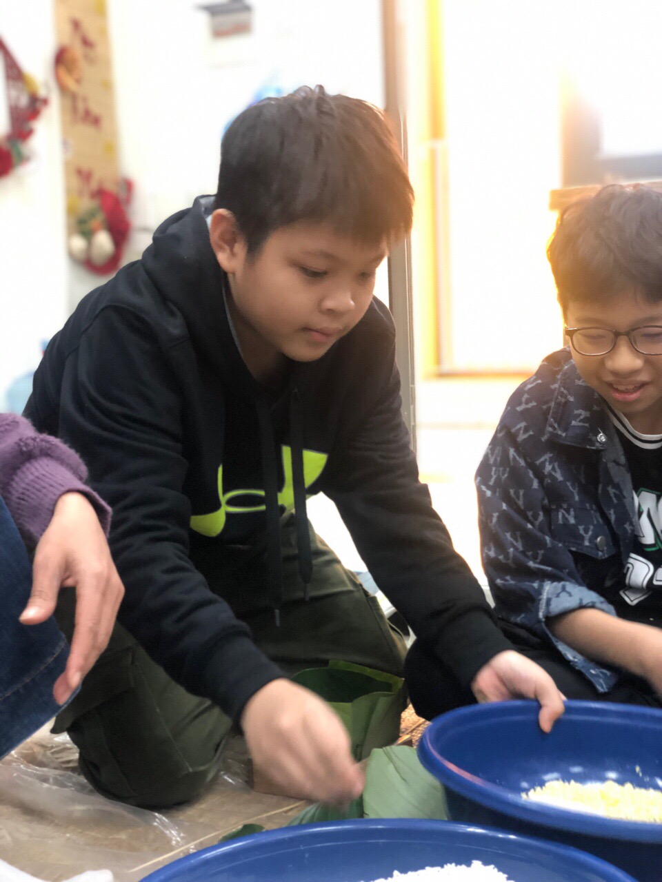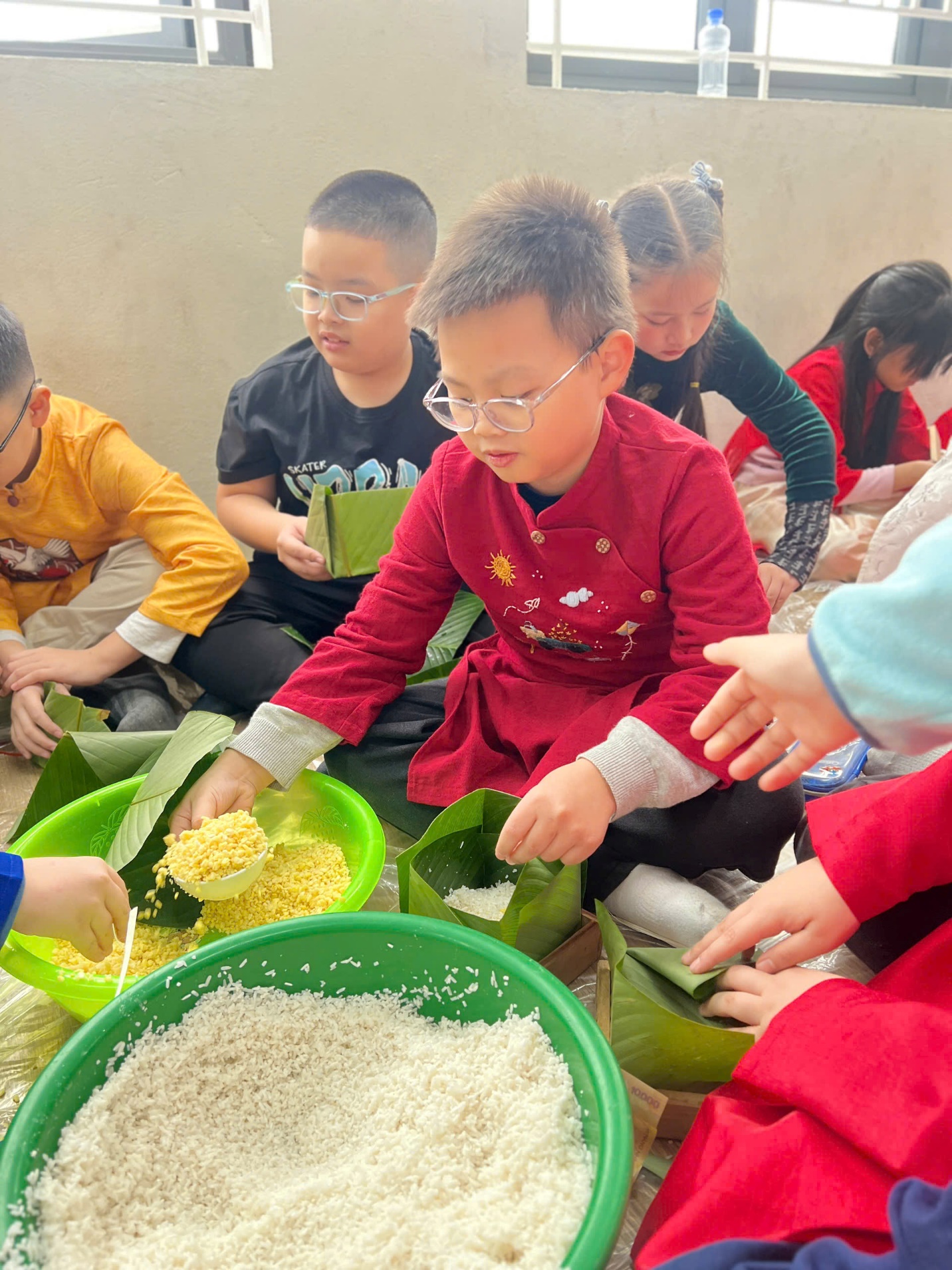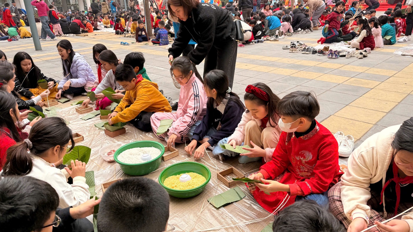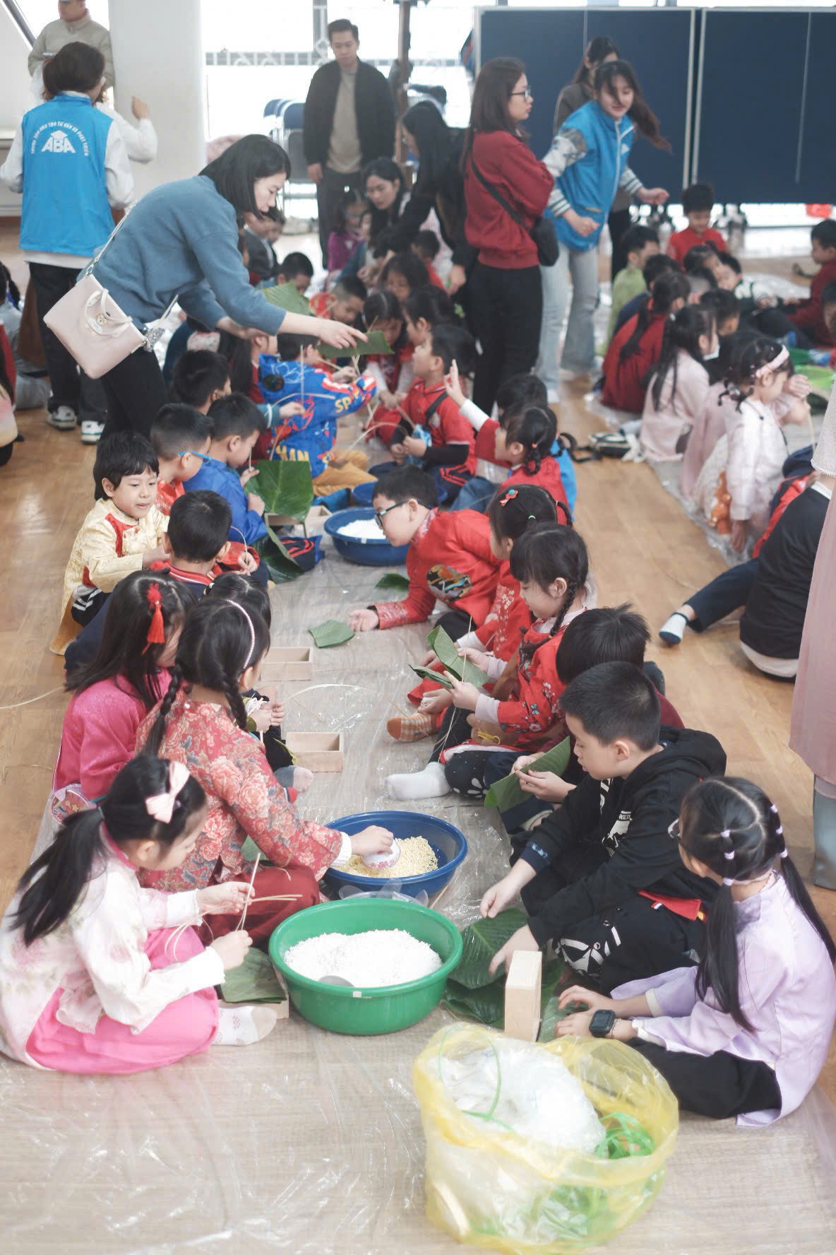Sau phần khai mạc, Lễ hội bánh chưng tiếp tục với các hoạt động hấp dẫn và thú vị. Một trong những hoạt động nổi bật là gói bánh chưng. Các em được chia thành lớp và cùng nhau tham gia gói bánh chưng, từ khâu chuẩn bị nguyên liệu cho đến việc gói bánh sao cho vuông vắn và đẹp mắt. Điều này không chỉ giúp các em hiểu rõ hơn về quy trình làm bánh mà còn rèn luyện sự khéo léo, kiên nhẫn. Và hơn hết, thông qua trải nghiệm này, các em sẽ hiểu được tầm quan trọng của tinh thần đồng đội và học cách làm việc hiệu quả trong nhóm.