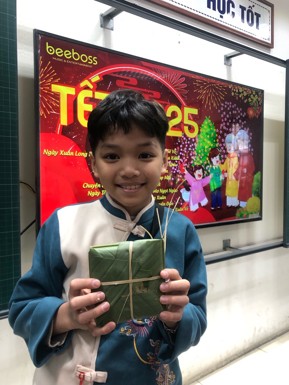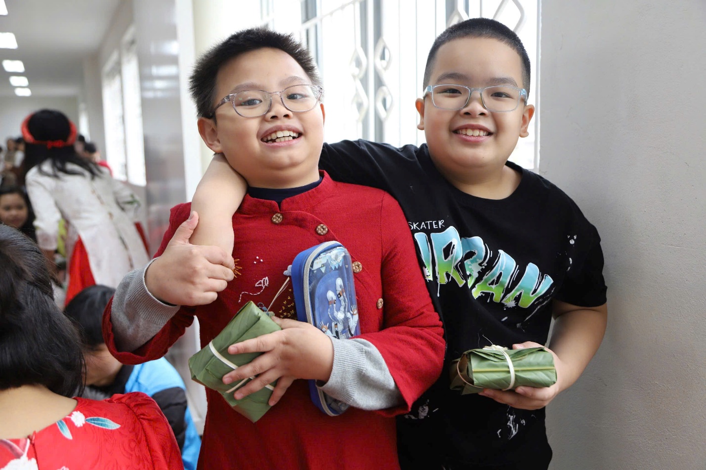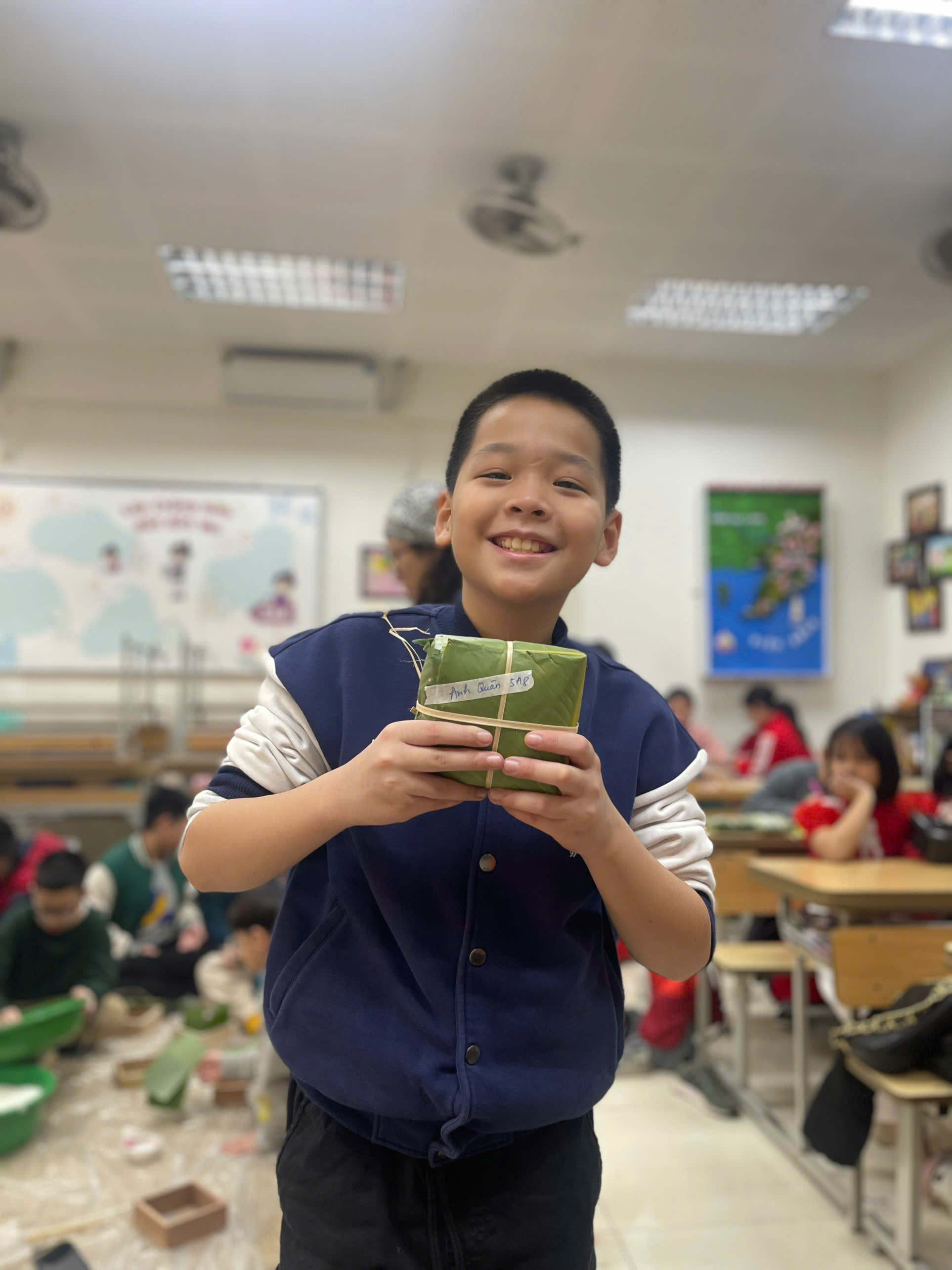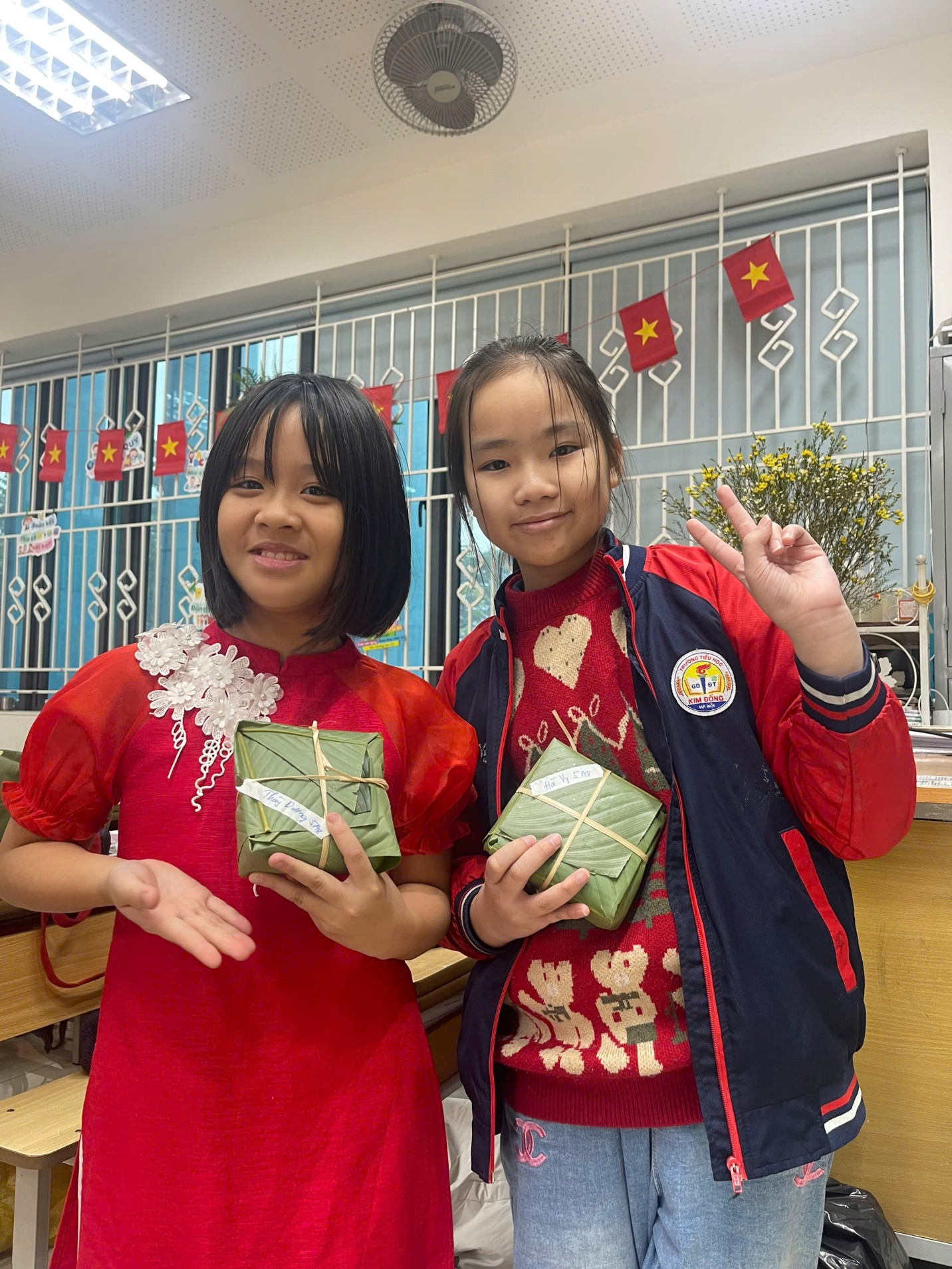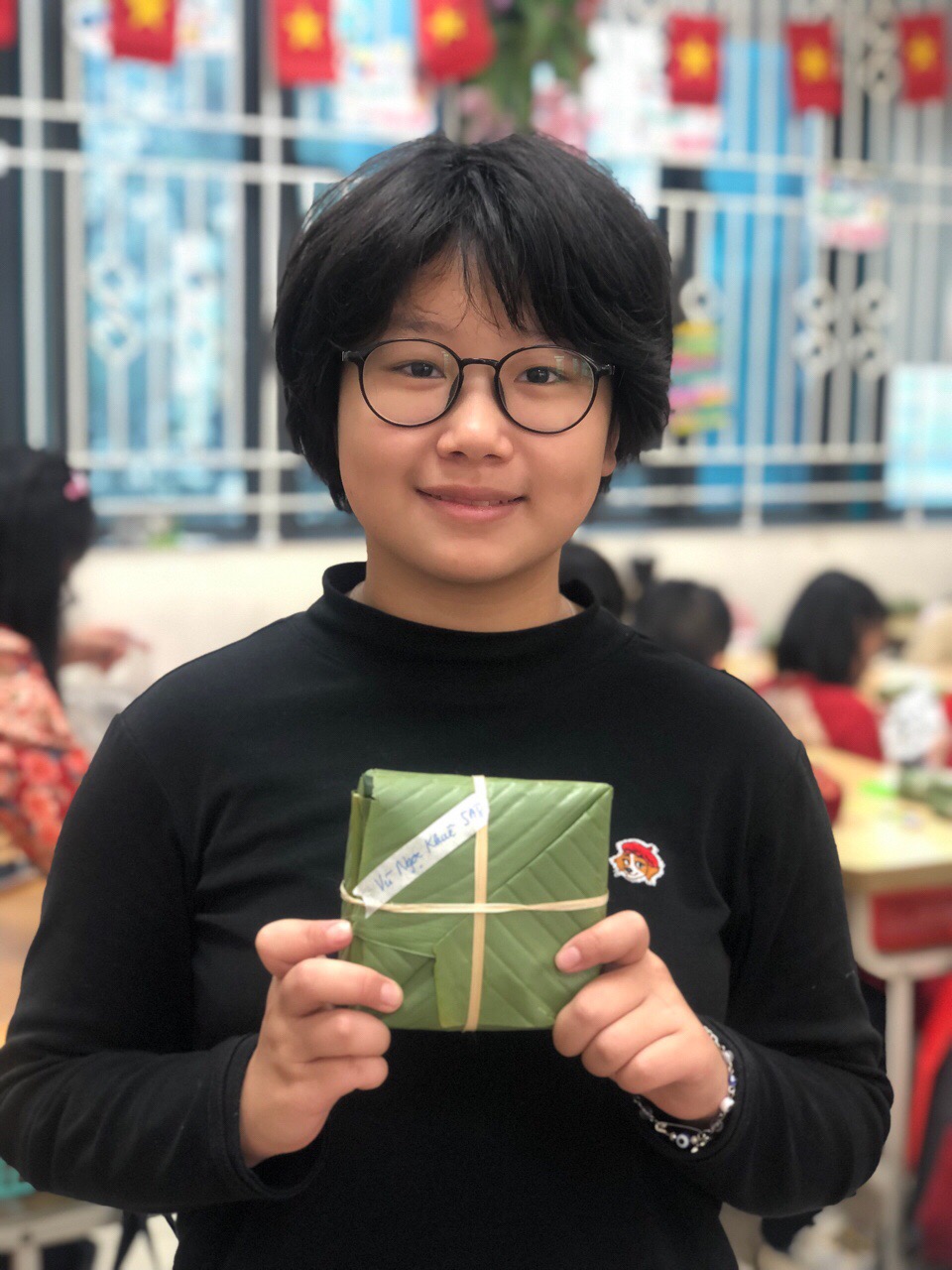 Niềm vui rạng rỡ trên khuôn mặt, nụ cười của các em như lan tỏa trong không khí lễ hội. Mỗi khi chiếc bánh hoàn thành, ánh mắt các em sáng lên đầy tự hào và vui sướng. Những tiếng cười nói rộn ràng, lời khen ngợi nhau khi bánh được gói thành công khiến không gian trở nên ấm áp và đầy tình cảm.
