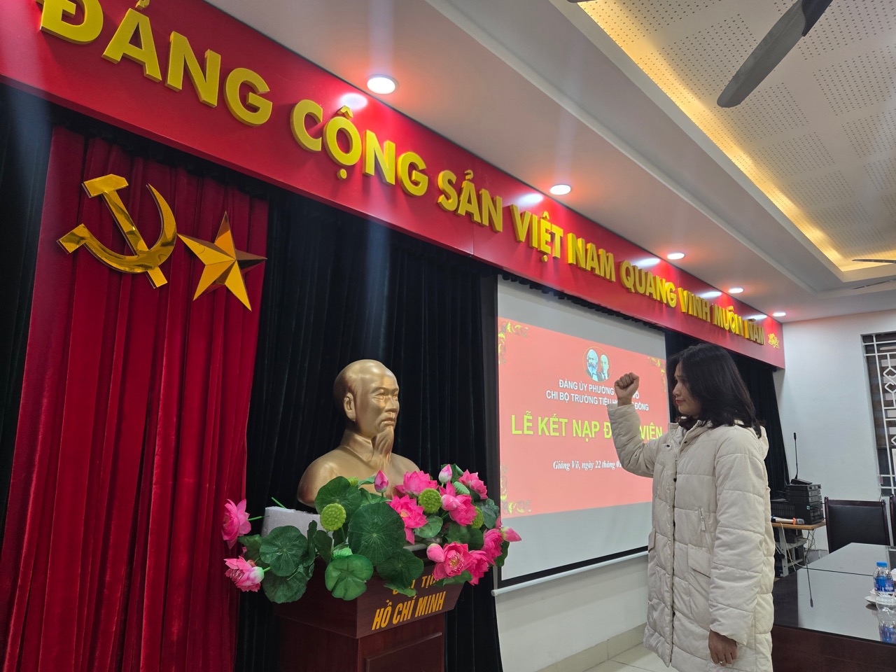 Tại buổi lễ, đồng chí Bí thư Chi bộ đã công bố Quyết định kết nạp Đảng viên của cấp có thẩm quyền đối với đồng chí Trần Thị Huyền. Trong giây phút thiêng liêng, đồng chí Đảng viên mới đã tuyên thệ trước cờ Đảng, cờ Tổ quốc và chân dung Chủ tịch Hồ Chí Minh, thể hiện quyết tâm tuyệt đối trung thành với mục tiêu, lý tưởng của Đảng; nghiêm chỉnh chấp hành Cương lĩnh chính trị, Điều lệ Đảng, nghị quyết, chỉ thị của Đảng; không ngừng rèn luyện phẩm chất đạo đức, nâng cao năng lực chuyên môn, hoàn thành tốt nhiệm vụ được giao.