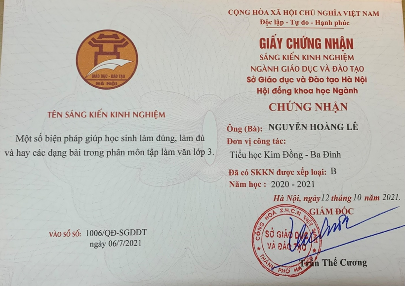 Chứng nhận sáng kiến kinh nghiệm của cô giáo Nguyễn Hoàng Lê