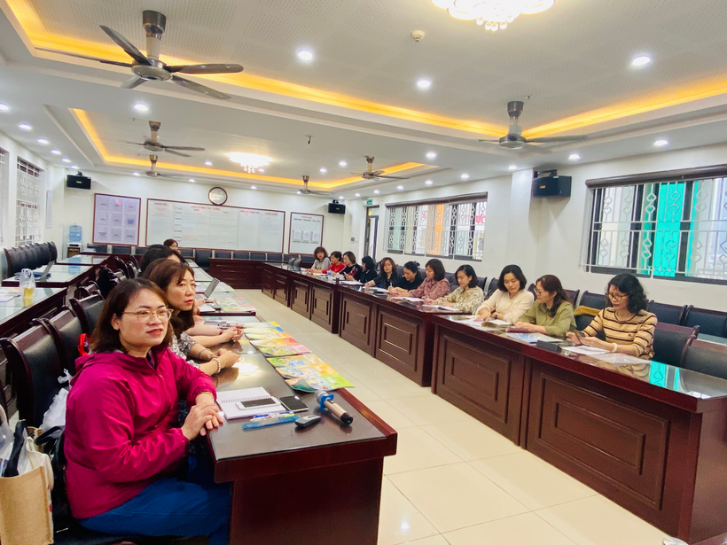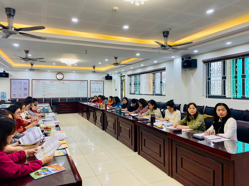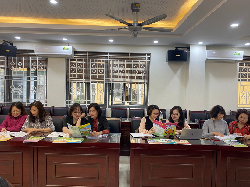 Giáo viên dạy lớp 4 trường Tiểu học Kim Đồng cùng nghiên cứu các bộ sách giáo khoa trong Hội nghị
