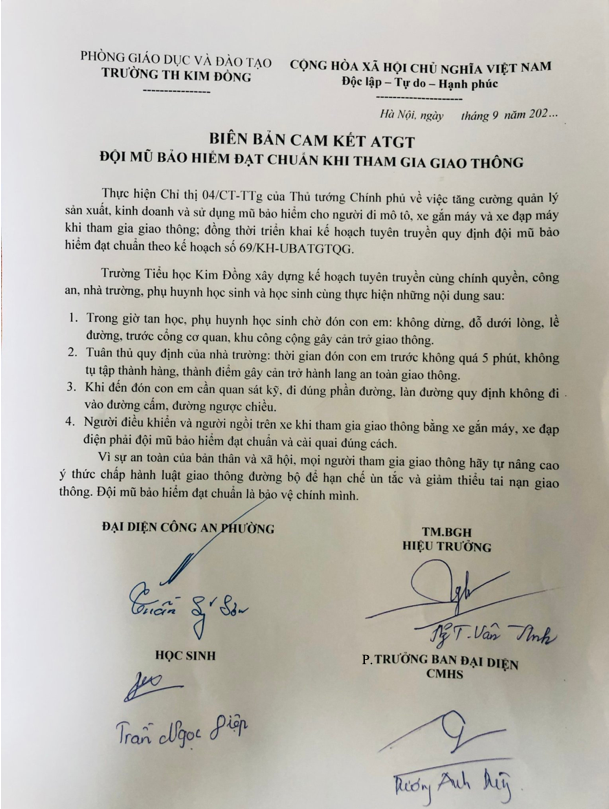 Tại buổi lễ, cô giáo Nguyễn Thị Vân Anh đã nêu rõ nội dung tuyên truyền, giáo dục ATGT luôn được nhà trường đặc biệt chú trọng, quan tâm không chỉ với học sinh mà còn tới CMHS. Thông qua đó, nhằm cung cấp kiến thức pháp luật về trật tự ATGT cho học sinh, đồng thời nhắc nhở, nêu cao ý thức gương mẫu của phụ huynh trong việc giáo dục, phòng tránh tai nạn giao thông cho con em mình. Đại diện chính quyền, công an, lãnh đạo nhà trường, học sinh và đại diện cha mẹ học sinh kí cam kết cùng nhà trường giao dục con em mình thực hiện tốt quy định về ATGT năm học 2022-2023.