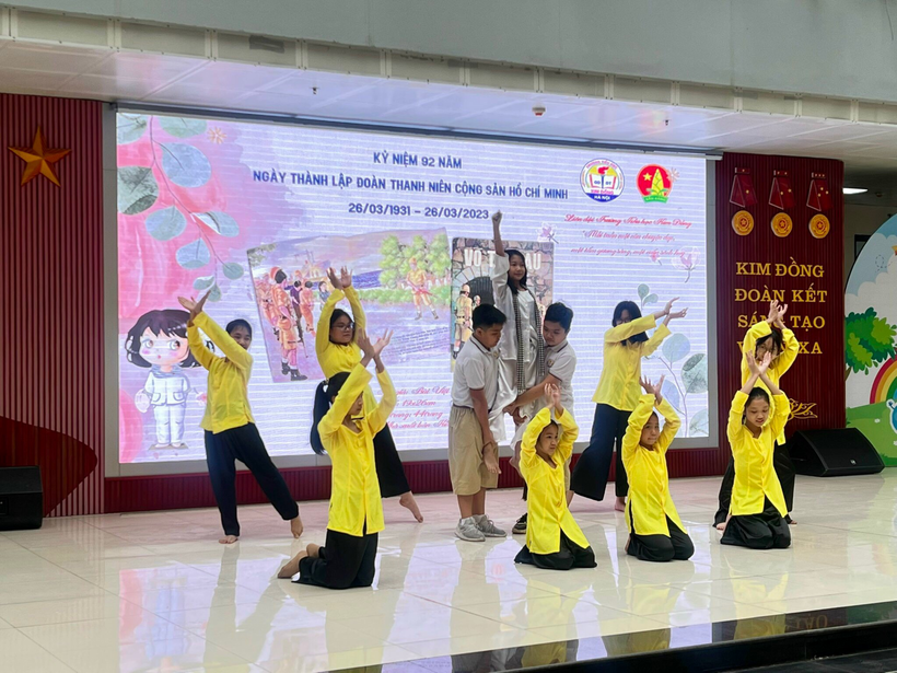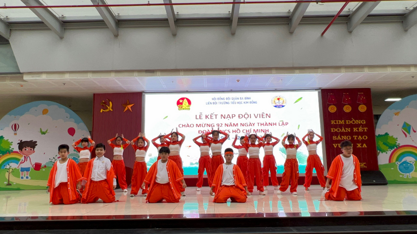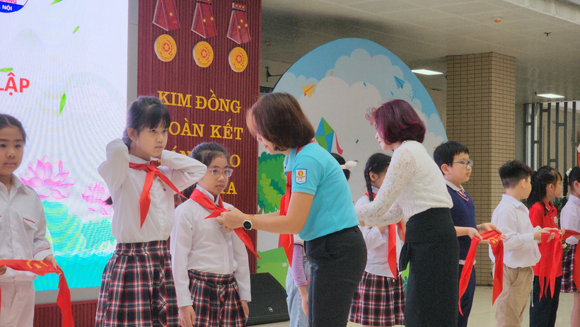 Phần đầu buổi sinh hoạt dưới Cờ là “Lễ kết nạp Đội viên mới cho 260 em học sinh khối 3, 4, 5 có quá trình học tập và rèn luyện tốt, đứng trong hàng ngũ của Đội Thiêu niên Tiền phong Hồ Chí Minh.