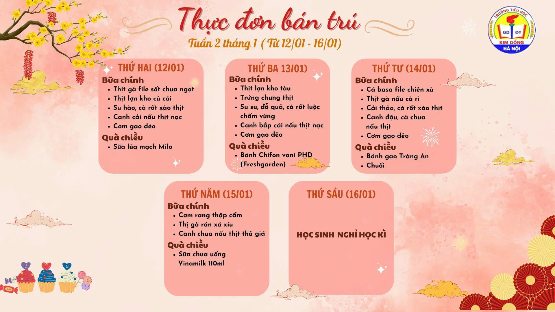 Thực đơn bán trú học sinh Tuần 2 tháng 1 - Trường Tiểu học Kim Đồng