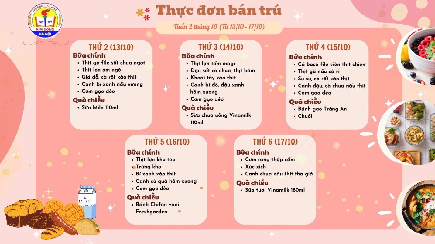 Thực đơn bán trú học sinh Tuần 2 tháng 10 - Trường Tiểu học Kim Đồng