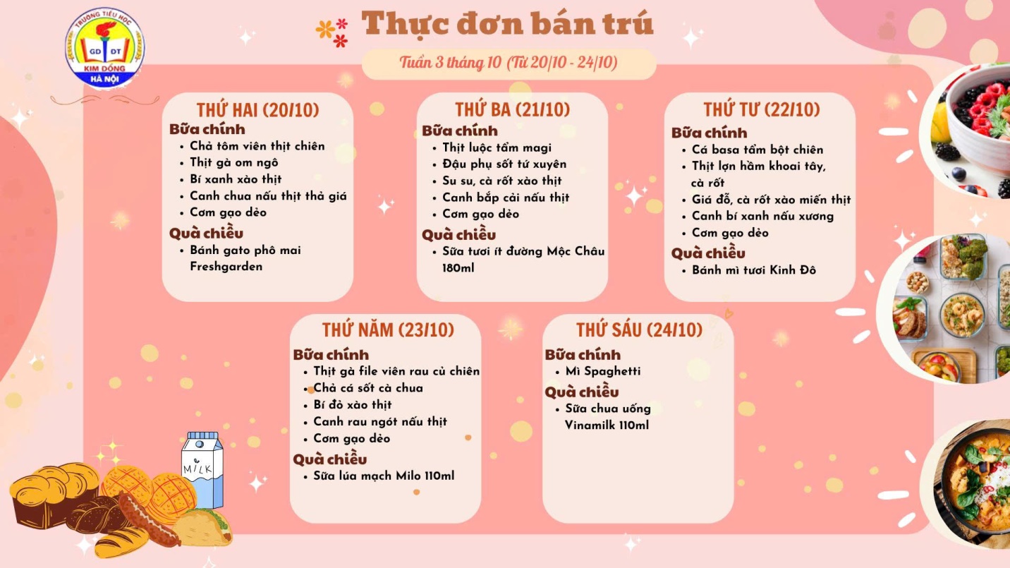 Thực đơn bán trú học sinh Tuần 3 tháng 10 - Trường Tiểu học Kim Đồng