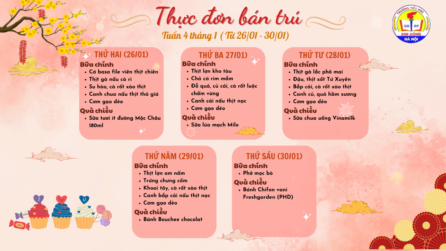 Thực đơn bán trú học sinh Tuần 4 tháng 1 - Trường Tiểu học Kim Đồng