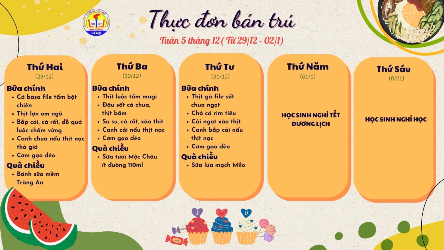 Thực đơn bán trú học sinh Tuần 5 tháng 12 - Trường Tiểu học Kim Đồng