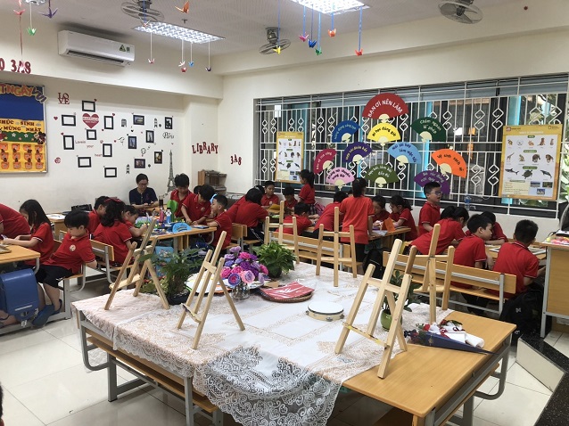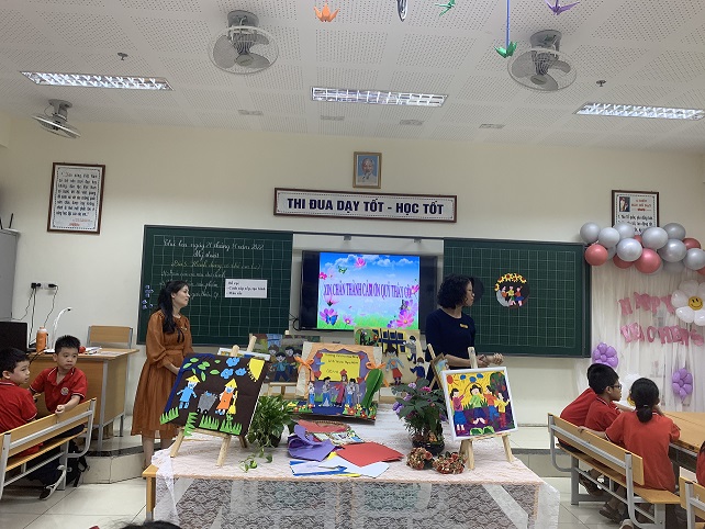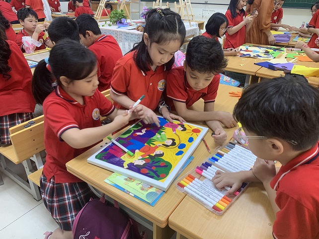 Được sự quan tâm tạo điều kiện của Ban Giám Hiệu trường Tiểu học Kim Đồng, đội ngũ giáo viên tổ Mĩ thuật đã nghiên cứu tìm tòi phương án và hình thức dạy học phù hợp có hiệu quả nhất. Tiết học được xây dựng với nhiều hình thức tổ chức học tập như thảo luận nhóm, chơi trò chơi, triển lãm....