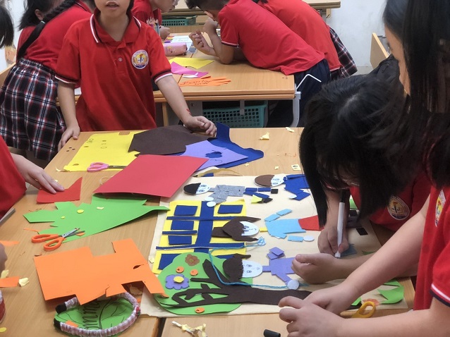 Học sinh hoàn thiện tranh cắt dán về giờ ra chơi