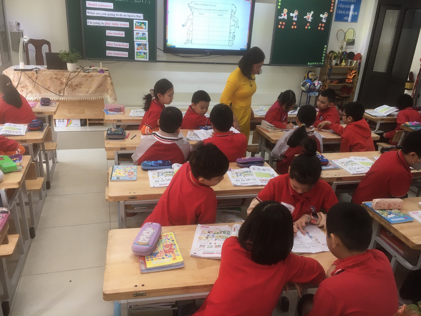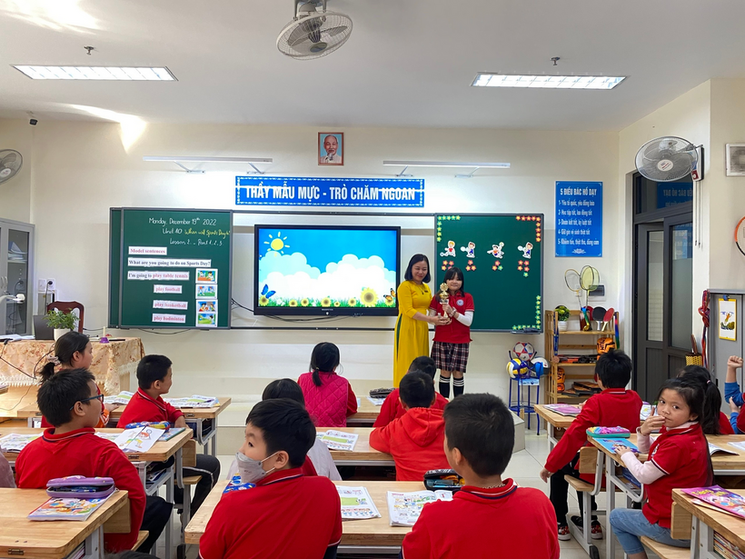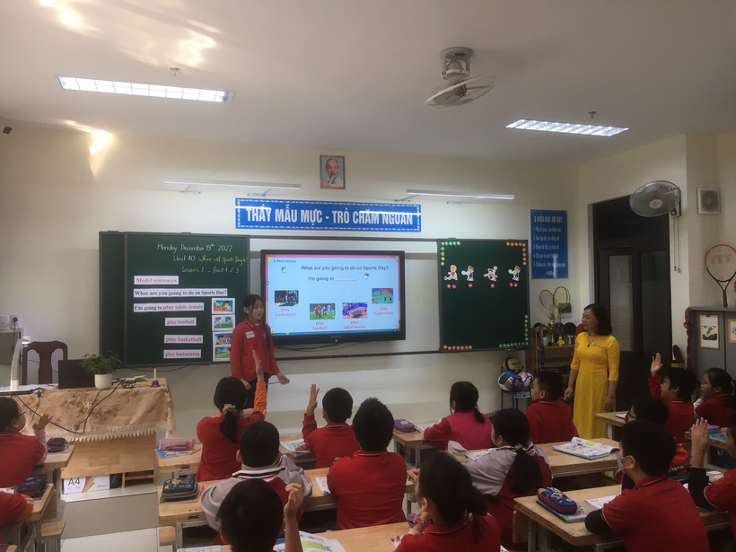 Tiết học với chủ đề “Ngày thể thao”, học sinh được mang dụng cụ thể thao yêu thích và giới thiệu với bạn bè của mình sẽ chơi môn đó thế nào vào ngày hội thể thao dựa trên mẫu câu “Tobe going to + V”. Với thông điệp “ Học sinh thỏa sức sáng tạo – Học sinh là trung tâm”, cô đã tạo điều kiện và cơ hội được sáng tạo và thể hiện tài năng ngoại ngữ của mình. Với chuyên môn vững vàng, cô đã hướng dẫn học sinh từng bước sử dụng mẫu câu đúng chuẩn.