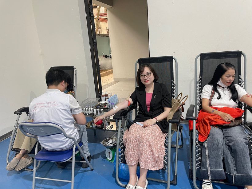 Đ/c Nguyễn Thị Ngọc Ánh - Chủ tịch công đoàn nhà trường cùng các đ/c công đoàn viên hưởng ứng ngày hội hiến máu tình nguyện.