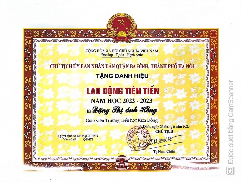 Gương cô giáo Đặng Thị Ánh Hồng – Trường Tiểu học Kim Đồng – Ba Đình - Hà Nội đã có nhiều thành tích trong công tác giảng dạy, nhiều năm liền là Lao động tiên tiến cấp Quận, những sáng kiến kinh nghiệm của cô đạt nhiều giải cao trong nhiều năm liên tiếp.