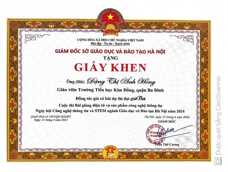 Không những thế, cô giáo còn dành nhiều giải cao về ứng dụng Công nghệ thông tin trong dạy học như Giải Nhất cuộc thi Xây dựng bài giảng điện tử Stem/steam Sản phẩm CNTT/STEM/STEAM cấp Quận; Giải Ba cuộc thi “Thiết kế bài giảng điện tử Elearning” cấp Thành phố năm học 2023-2024.