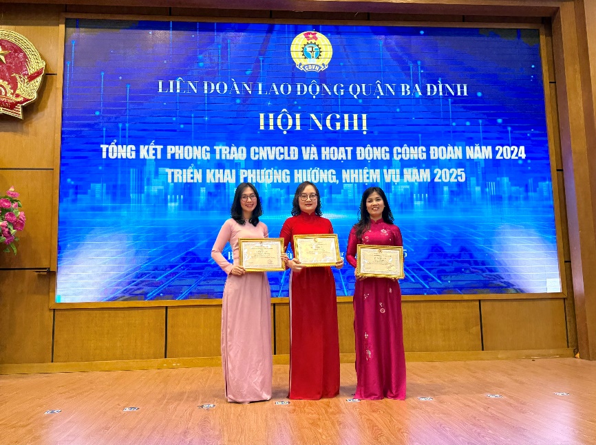 Đặc biệt đầu năm 2025 cô giáo Đặng Thị Ánh Hồng rất vinh dự được Liên đoàn lao động Quận Ba Đình tặng Giấy khen đã có thành tích Xuất sắc trong phong trào thi đua “Sáng kiến, sáng tạo trong CNVCLĐ quận Ba Đình” năm 2024.