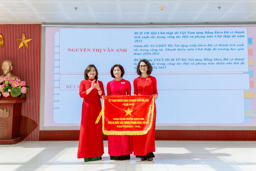 Bà Vũ Thị Thêu – Quận ủy viên – BT Đảng ủy Phường Giảng Võ trao cờ xuất sắc Thi đua cấp Thành phố cho nhà trường