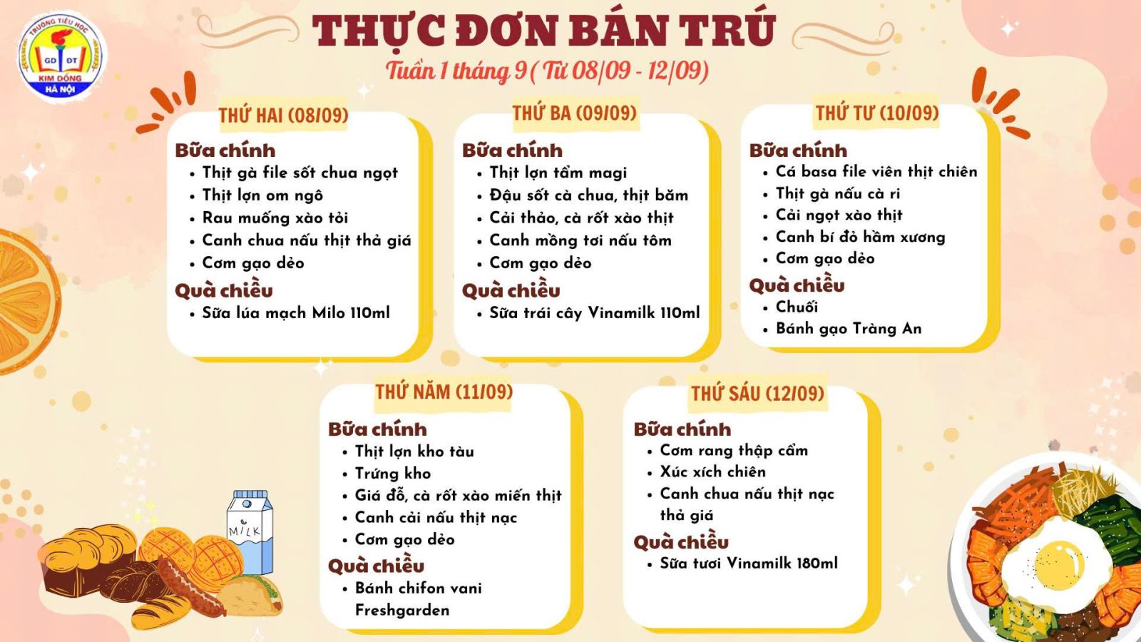 Trường Tiểu học Kim Đồng thông báo thực đơn bán trú học sinh tuần 1 tháng 9 (từ 08/9 - 12/9)