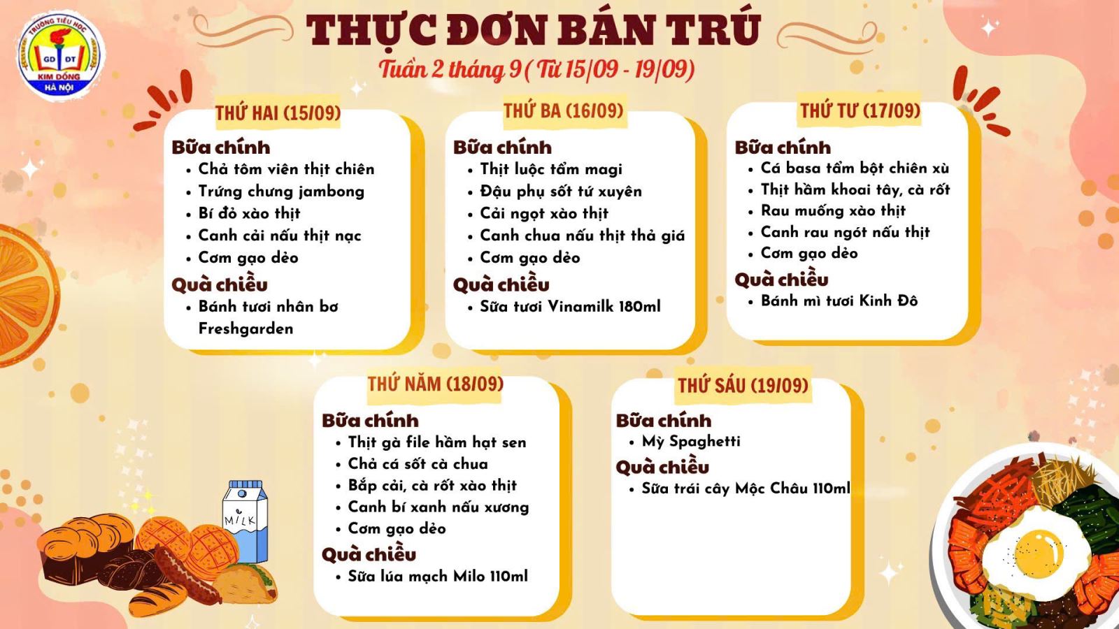 Trường Tiểu học Kim Đồng thông báo thực đơn bán trú học sinh tuần 2 tháng 9 (từ 15/9 - 19/9)