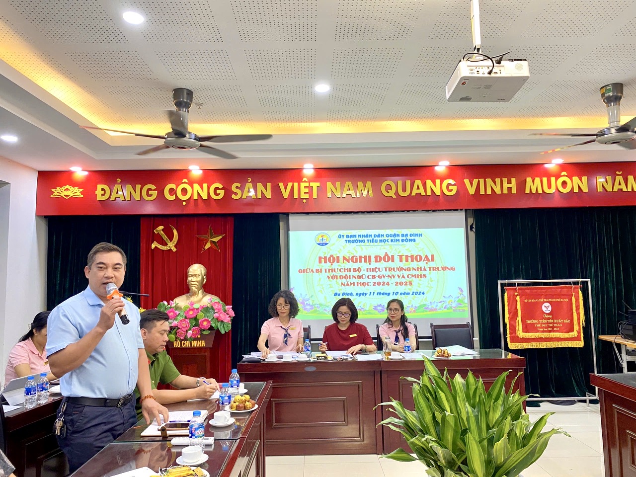 Tham dự Hội nghị có ông Chu Xuân Thịnh – Chủ tịch Mặt trận Tổ quốc phường Giảng Võ; bà Nguyễn Thị Hồng Hạnh – Phó BPH trường; bác Bùi Văn Lập - Tổ trưởng tổ dân phố số 2, đồng chí đại diện Công an phường Giảng Võ cùng 42 phụ huynh học sinh đại diện 42 lớp. Về phía nhà trường có cô giáo Nguyễn Thị Vân Anh, Bí thư Chi bộ, Hiệu trưởng nhà trường; cán bộ, giáo viên, nhân viên nhà trường. Các báo cáo và các câu hỏi đối thoại tại Hội nghị tập trung vào nội dung chính “Nâng cao phát triển giáo dục toàn diện trong nhà trường và hướng tới hội nhập quốc tế năm học 2024 - 2025”.