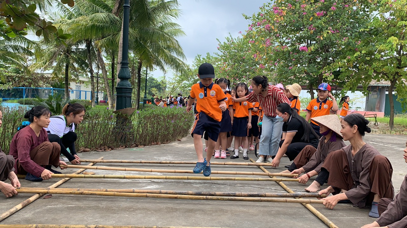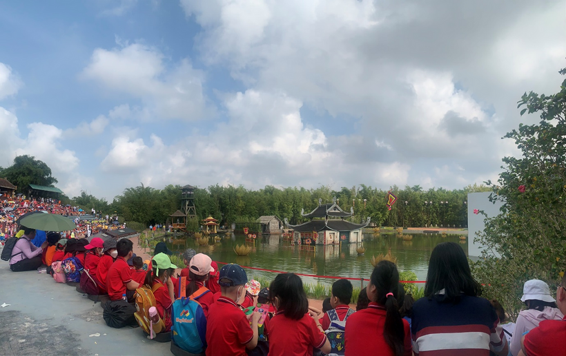 Học sinh hào hứng với tiết mục múa rối nước, nhiều em thích thú vì lần đầu được xem bộ môn nghệ thuật này.