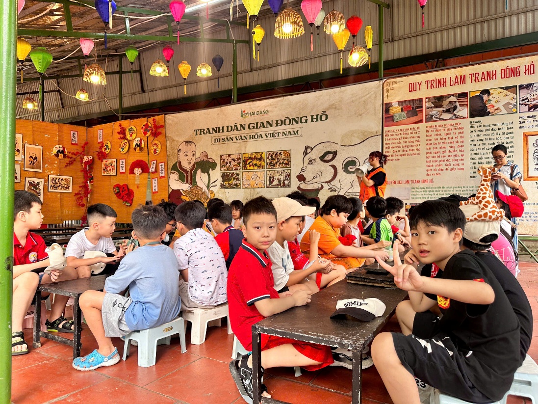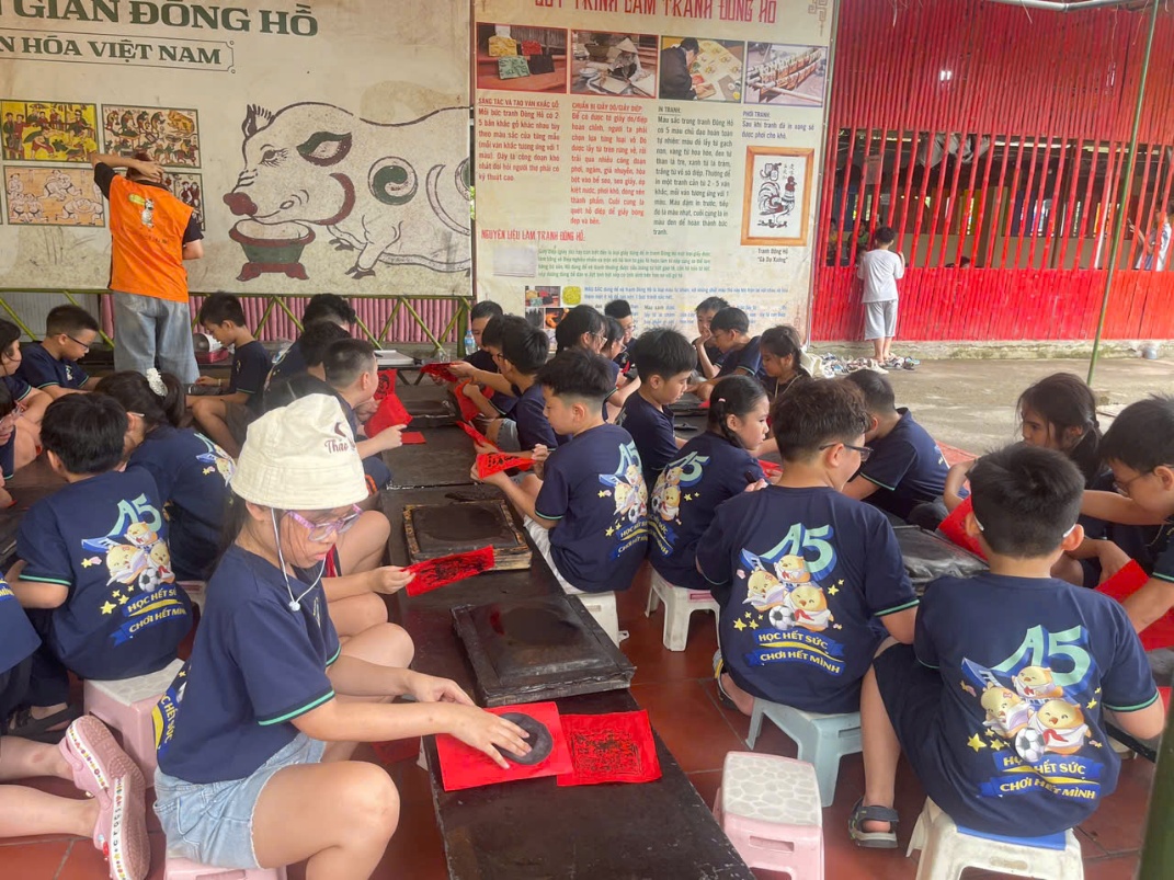 Buổi sáng tại trang trại mang chủ đề "Chạm đất quê hương", các em học sinh được hòa mình vào không gian văn hóa truyền thống. Thật tự hào khi thấy những đôi bàn tay nhỏ nhắn cẩn thận thực hành in từng bức tranh Đông Hồ.