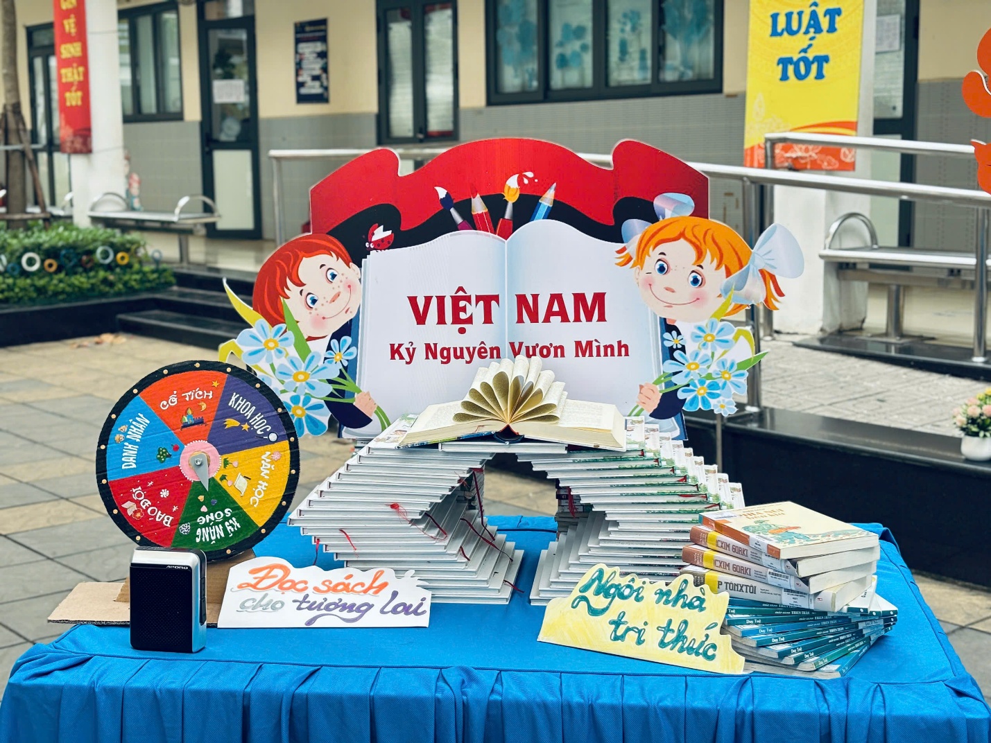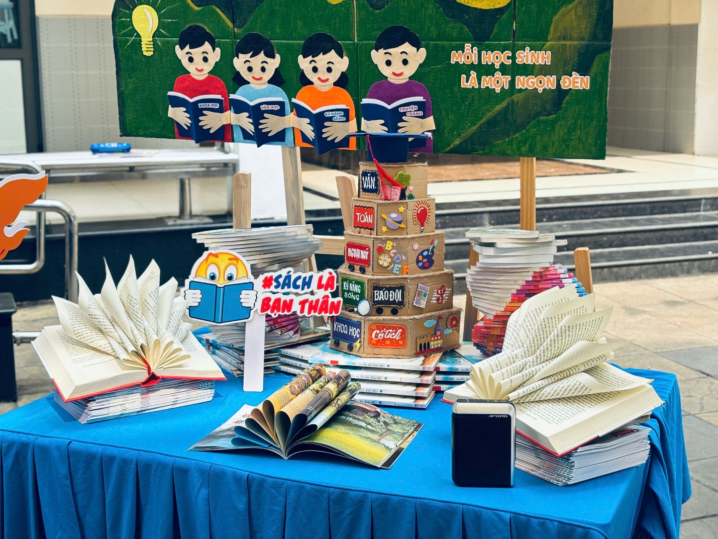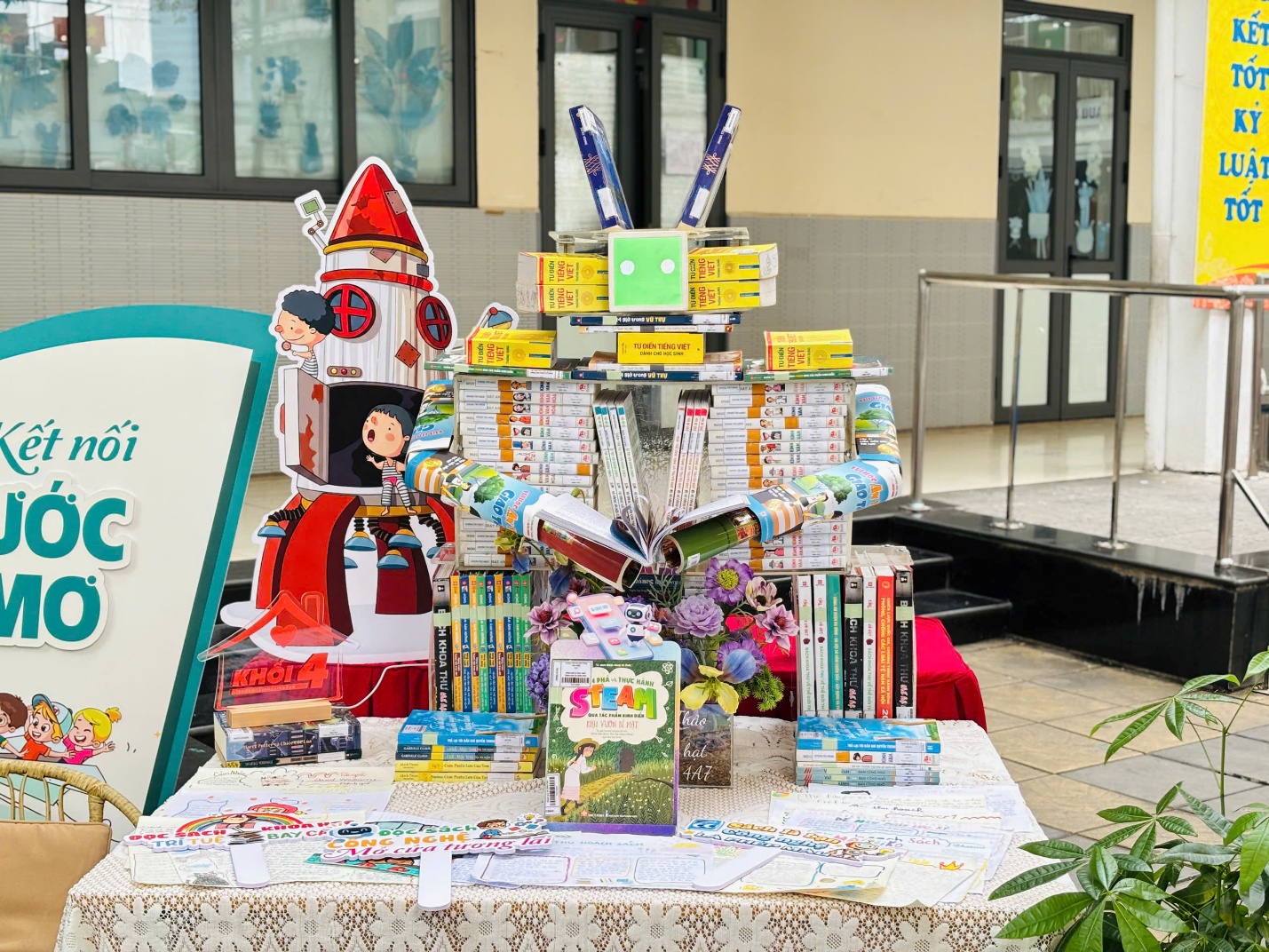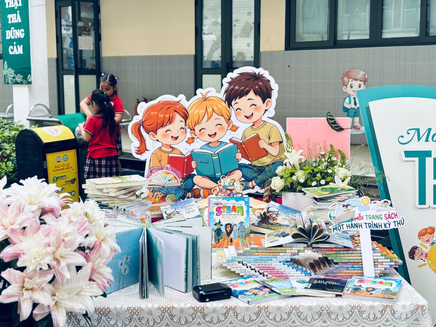 Tại khu vực trưng bày sách, không gian trường học như trở thành một bảo tàng nghệ thuật với cuộc thi Xếp sách nghệ thuật. Bằng sự khéo léo và tinh thần đoàn kết, các khối lớp đã biến những cuốn sách ngay ngắn thành những mô hình kỳ công, mang theo nhiều thông điệp ý nghĩa về tình yêu quê hương, đất nước và con thuyền tri thức.